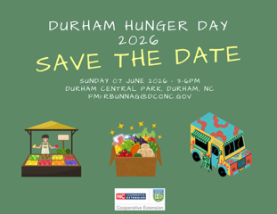Durham Hunger Day 2026 Join Us for Durham’s 5th Annual World Hunger Day event! Sunday, June 7 from 3-6pm at Durham Central Park. This is a day to raise awareness and honor the incredible organizations working to eliminate hunger in Durham. + Add to Google Calendar + iCal / Outlook export 00 days 00 hours 00 minutes 00 seconds Date Jun 07 2026 Time 3:00 pm - 6:00 pm Location Durham Central Park 501 Foster St, Durham, NC 27701 Website https://durhamcentralpark.org Category Advocacy Share this event