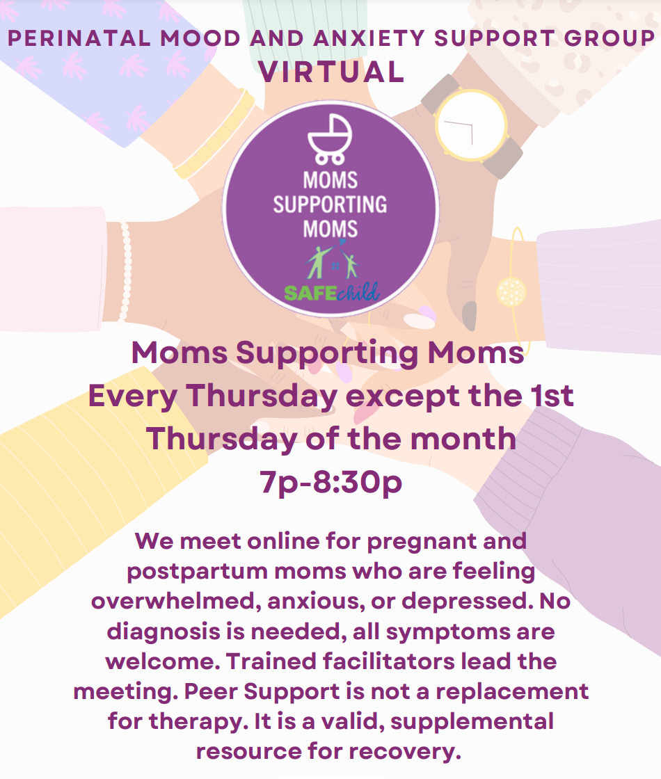 SAFEchild’s Moms Supporting Moms Program offers a free, virtual PMADS Support Group every Thursday except the first Thursday of the month. Participants must register via SAFEchild’s website to attend the virtual meetings. Birthing people from all counties are welcome to attend.